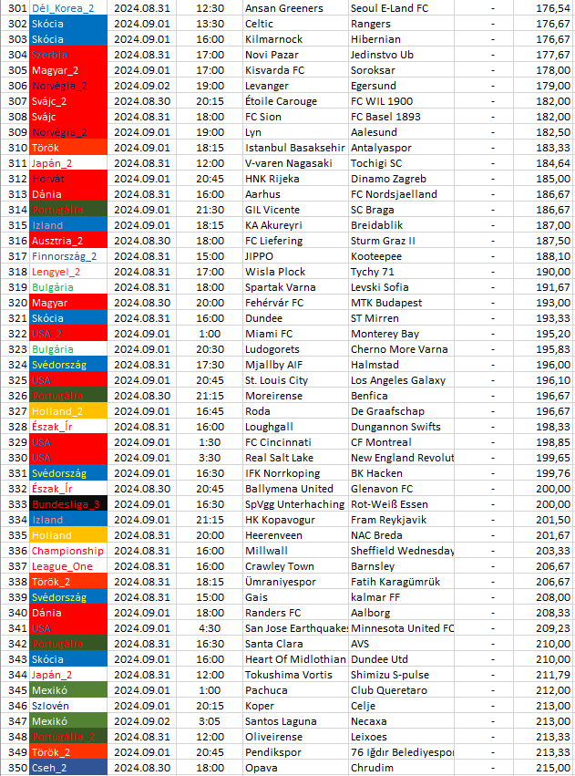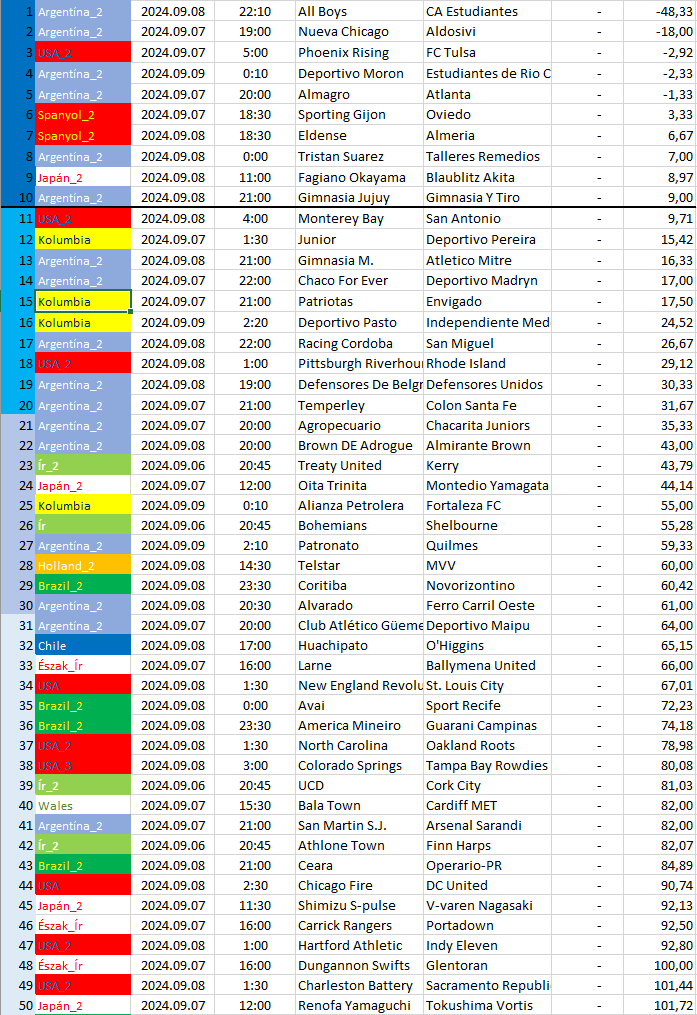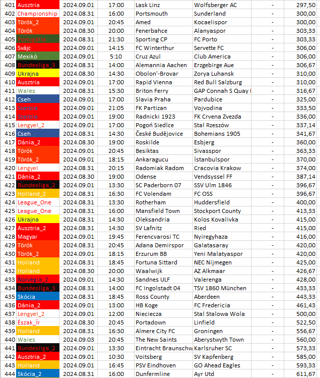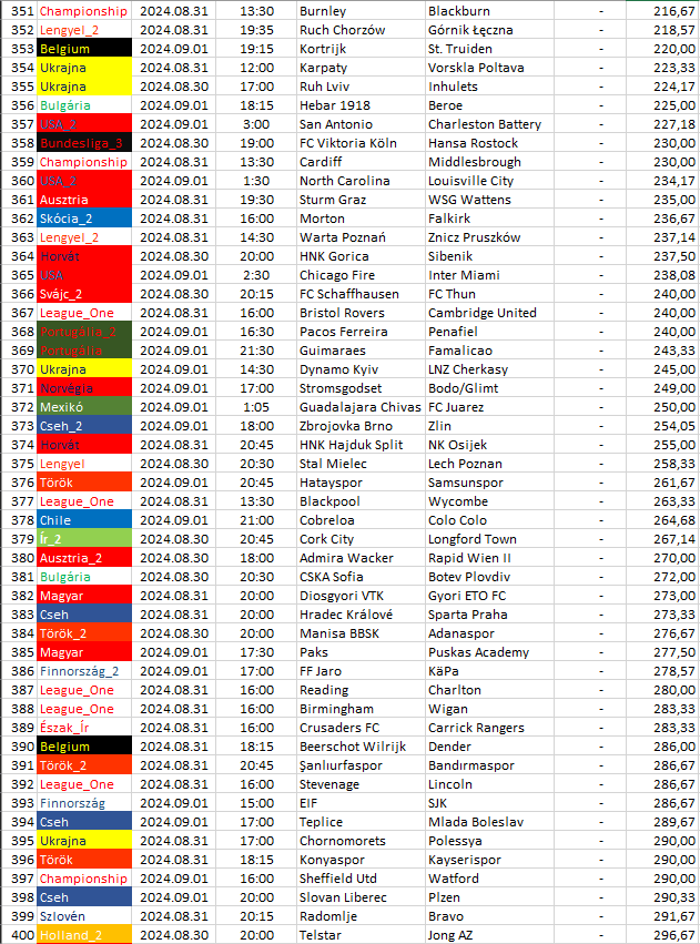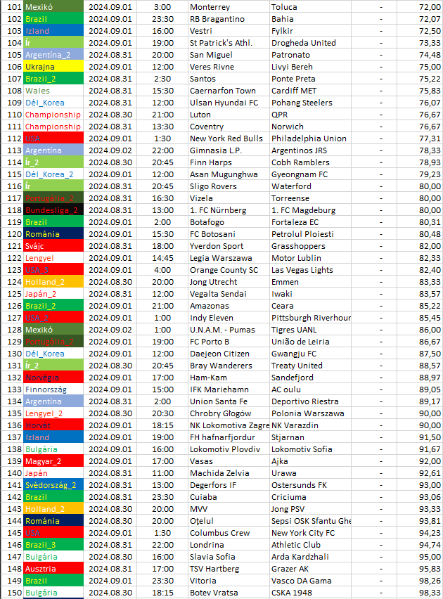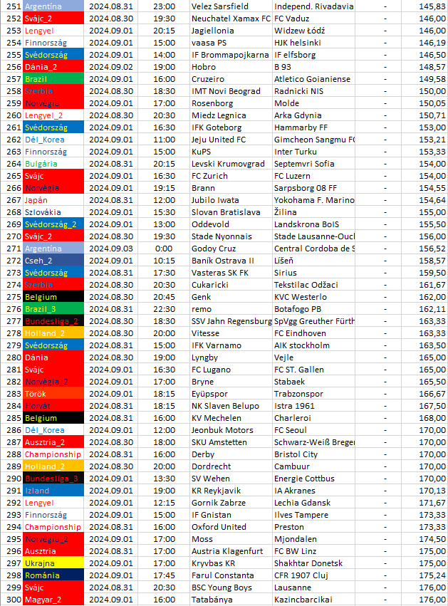 Ebben a táblázatban az összes elemzett ország mégkőzései vannak sorrendben a pontszámaik alapján. A legkisebb pontszámú mérkőzésnek van a legnagyobb esélye arra, hogy a végeredménye döntetlen legyen.