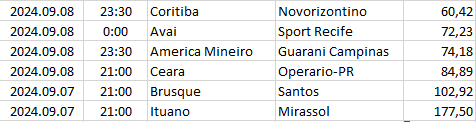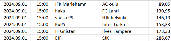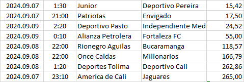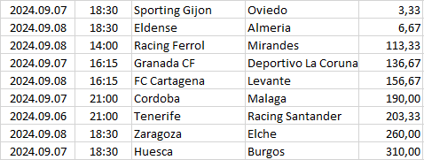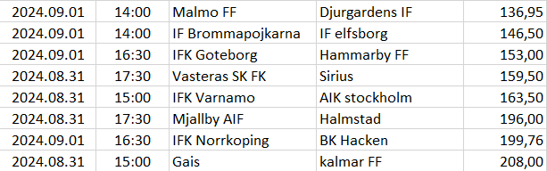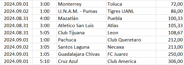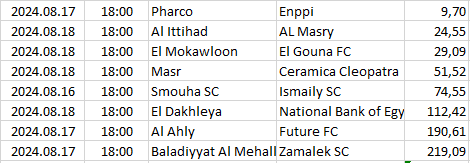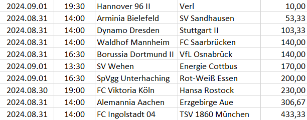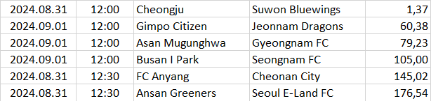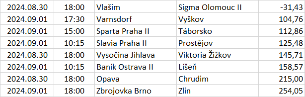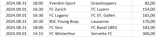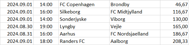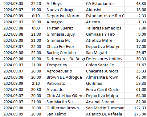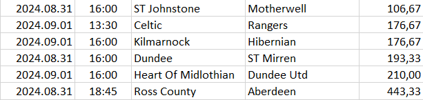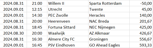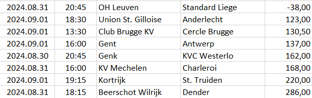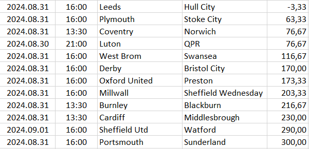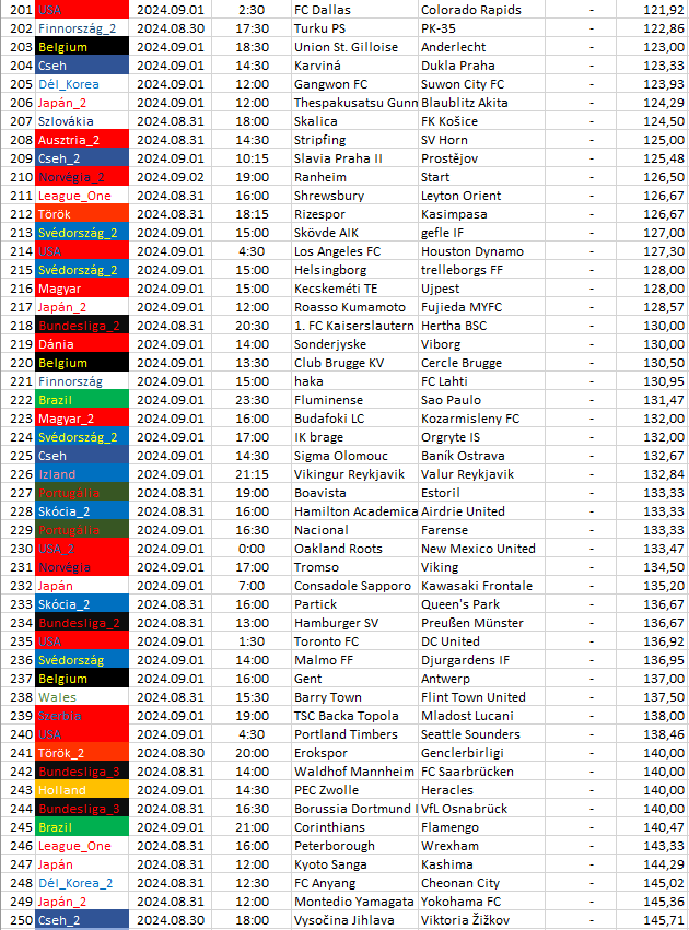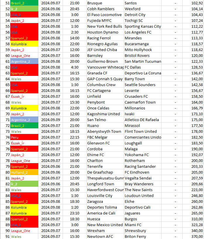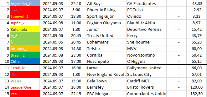 Ebben a táblázatban az összes elemzett ország mégkőzései vannak sorrendben a pontszámaik alapján. A legkisebb pontszámú mérkőzésnek van a legnagyobb esélye arra, hogy a végeredménye döntetlen legyen.
