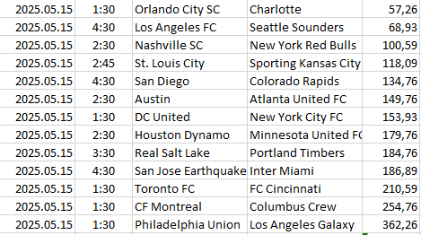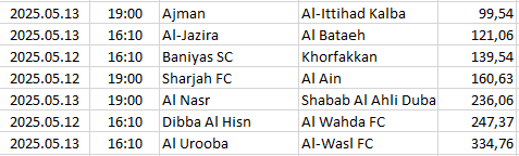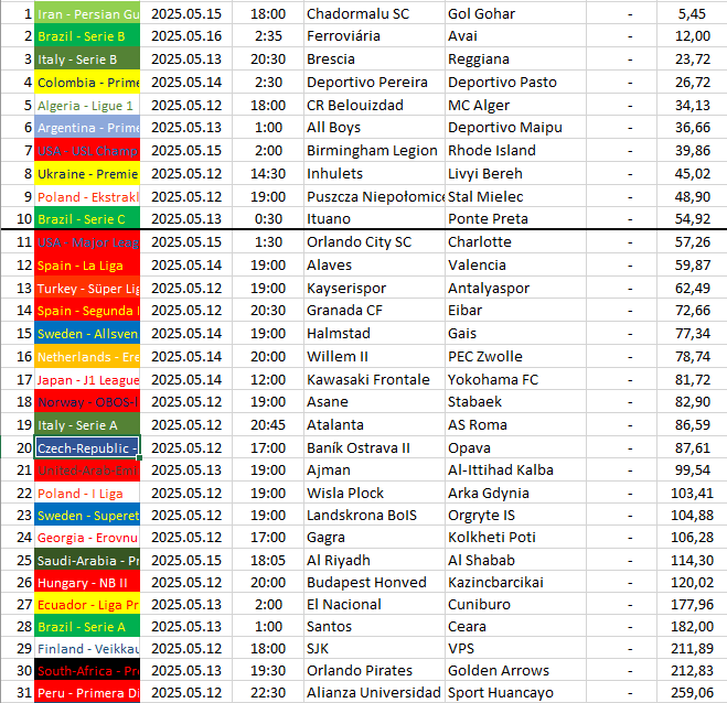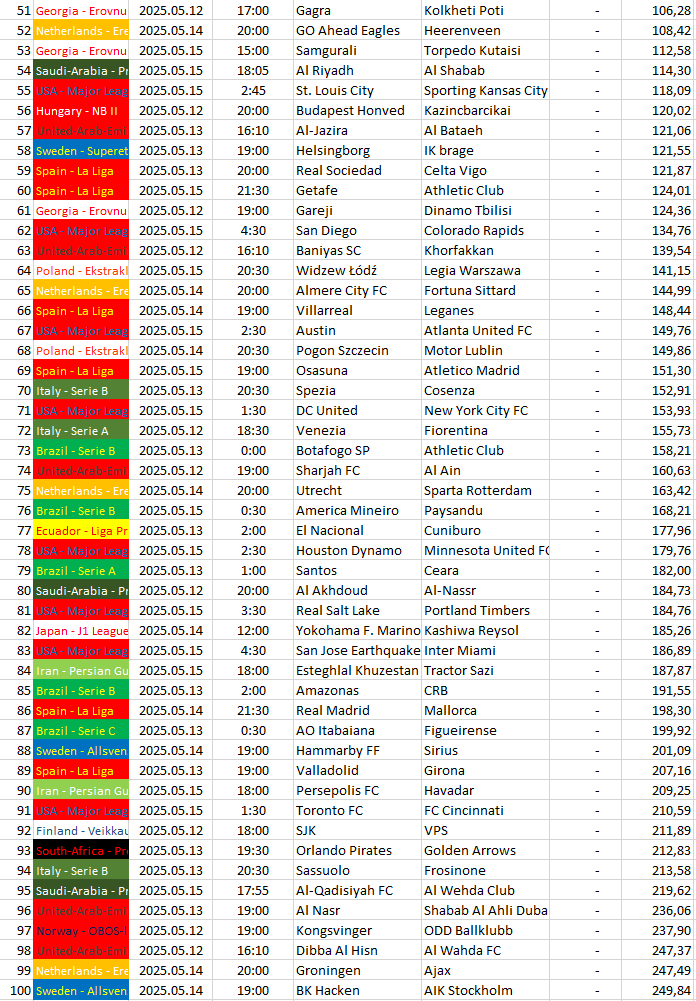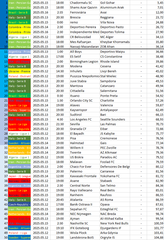 Ebben a táblázatban az összes elemzett ország mégkőzései vannak sorrendben a pontszámaik alapján. A legkisebb pontszámú mérkőzésnek van a legnagyobb esélye arra, hogy a végeredménye döntetlen legyen.