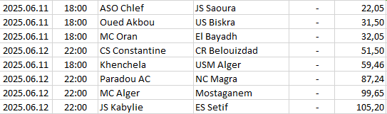 | 20 | Argentina - Primera Nacional | 2025.06.14 | 18:40 | Defensores De Belgrano | Gimnasia Jujuy | 39,95 |