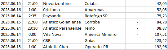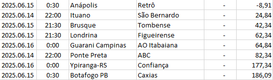 | 4 | Brazil - Serie C | 2025.06.15 | 0:30 | Anápolis | Retrô | -8,91 |