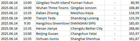 | 213 | China - Super League | 2025.06.14 | 13:35 | Sichuan Jiuniu | Shanghai Shenhua | 361,87 |