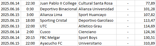 | 205 | Peru - Primera División | 2025.06.15 | 22:00 | Ayacucho FC | Universitario | 310,89 |