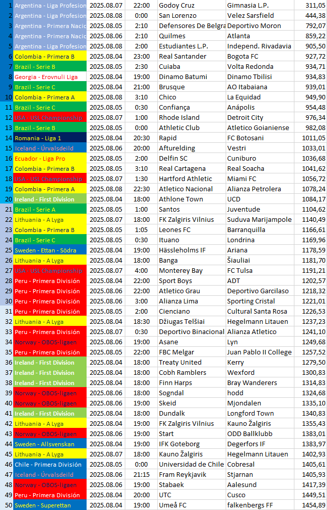| 6 | Colombia - Primera B | 2025.08.04 | 23:00 | Real Santander | Bogota FC | 927,72 |