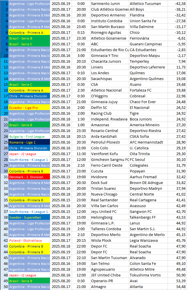 | 9 | Argentina - Primera Nacional | 2025.08.17 | 21:00 | Estudiantes de Rio Cuarto | CA Estudiantes | -2,83 |