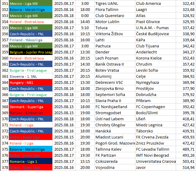| 376 | Serbia - Super Liga | 2025.08.17 | 19:30 | FK Partizan | IMT Novi Beograd | 493,26 |