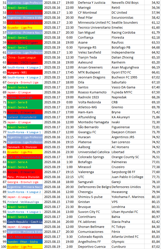 | 50 | Argentina - Primera Nacional | 2025.08.17 | 21:00 | Almagro | Atlanta | 54,48 |