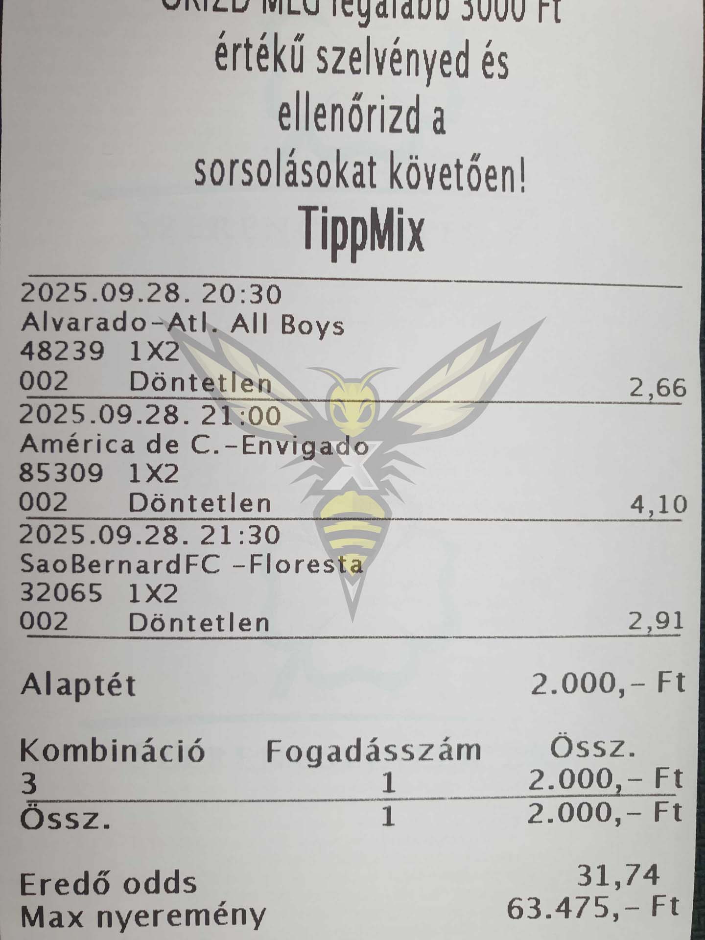 | 3 | Argentina - Primera Nacional | 2025.09.28 | 20:30 | Alvarado | All Boys | -37,52 |